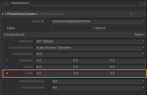 | 3. | xform.interactive에서 스케일은 각 X, Y, Z 축에서 3.0으로 설정됩니다. 노드 그래프에서 PrimitiveCreate 노드로 돌아가서 Z 스케일 값 5.0을 입력하십시오. |