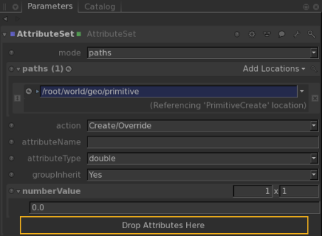 팁: 의 속성을 마우스 가운데 버튼으로 클릭하고 끌 수 있습니다. Attributes 탭 Drop Attributes Here AttributeSet 노드의 핫스팟 Parameters 드래그 한 속성을 설정하는 필드를 자동으로 생성하려면 탭을 클릭하십시오.