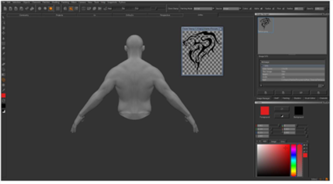 다른 페인트 프로그램과 마찬가지로 Mari 이미지 파일을 대상체 표면에 겹쳐 놓을 수 있습니다. 이미지 파일을 관리하려면 Mari 포함 Image Manager 팔레트. 에로드 한 이미지로 페인트하려면 Image Manager 팔레트, Mari 두 가지 주요 도구가 있습니다. Paint through 과 Clonestamp: