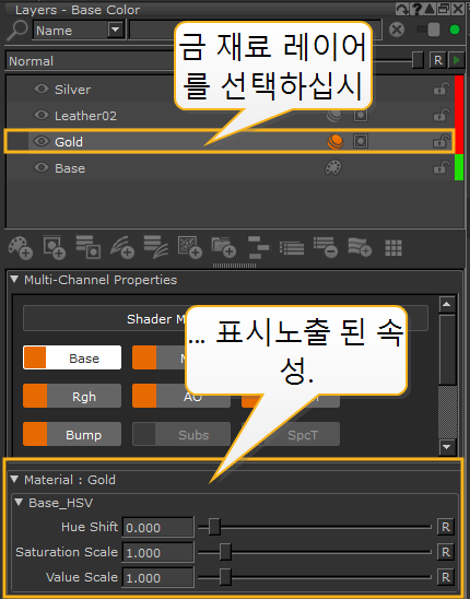 필요한 재료 레이어 (또는 다중 채널 레이어라고도 함)를 클릭하여 노출 된 속성 또는 컨트롤을 표시합니다. 그런 다음 다른 컨트롤을 사용하여 속성 값을 변경할 수 있습니다. 예를 들어 슬라이더를 사용하여 Hue Shift 의 가치 Gold 재료.