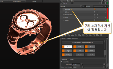 재질을 전체 자산에 적용하고 (캔버스 참조) 레이어 스택에 다른 다중 채널 레이어를 추가합니다.