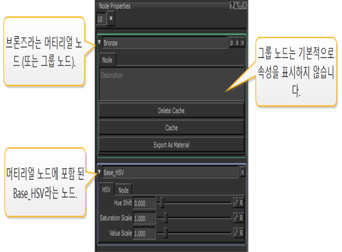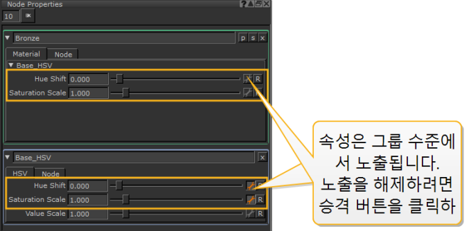 머티리얼 노드 레벨에서 노드의 속성이 노출됩니다.