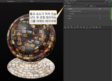 두 조정 레이어가 모두 그룹에 있으므로 그룹 내 스택의 맨 아래에 적용되므로이 예에서 타일 레이어는 아래 레이어에 적용되지 않습니다.