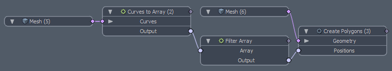 예를 들어, 다음 리그는 커브에서 배열을 생성합니다. 그런 다음 배열을 필터링하고 Create Polygons 메쉬 작업에서 위치 20 ~ 45 만 사용하여 다른 곡선을 만듭니다.