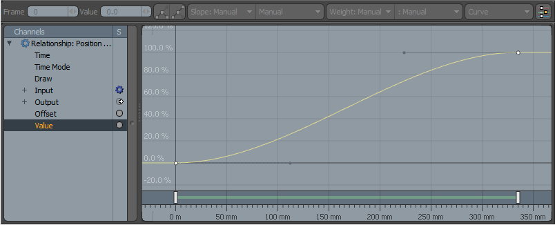 당신은 그것을 볼 수 있습니다 Modo 생성 된 키 프레임을 Value 관계 수정 자 항목의 채널. 드라이버 값은 길이와 구동 값, 높이를 따라 나타납니다. 노란색 선은 두 채널 간의 관계를 그래프로 나타내며 값 사이를 부드럽게 보간합니다. 키 프레임의 기울기와 가중치를 수정하면 중간 보간 값이 수정됩니다. 그래프 편집기 키 프레임 수정에 대한 자세한 내용은 그래프 편집기 이야기. Relationship 수정 자 및 사용법에 대한 자세한 정보는 다음을 참조하십시오. 채널 수정 자.