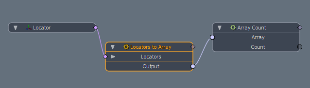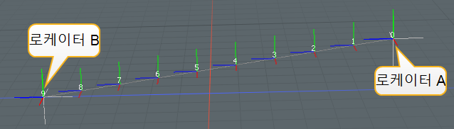 아래 예는 두 로케이터의 월드 위치를 나타냅니다 (Locator A 과 Locator B)을 사용하여 출력 배열을 만듭니다. 그만큼 Count 속성은 10으로 설정되므로 수정자는 로케이터 사이에 8 개의 추가 점을 만듭니다.