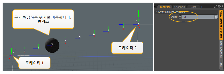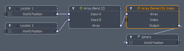 아래 예는 다음을 사용하여 두 개의 로케이터 위치에서 생성 된 어레이를 보여줍니다. 배열 수정 자. 그러면 인덱스 별 배열 요소가 구의 위치를 구동하는 데 사용됩니다. 변경하면 Index 의 가치 Array Element by Index 의 노드 Properties 오른쪽 패널에서 구는 3D 뷰포트에서 해당 위치로 이동합니다.