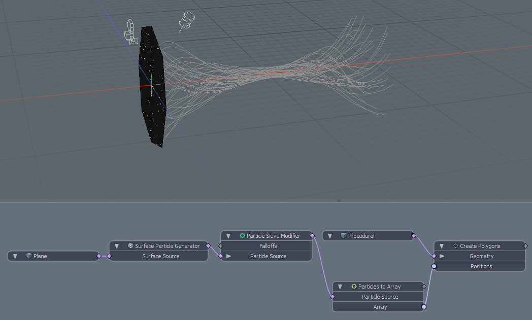 아래 예제는 평면을 가로 질러 입자를 생성하는 표면 생성기가있는 평면을 보여줍니다. 평면 변환은 공간을 통해 애니메이션됩니다. Particles to Array 수정자는 매 시간 단계마다 입자를 샘플링하고 Create Polygons 메쉬 작업은 입자 궤적을 추적하는 곡선을 생성합니다.