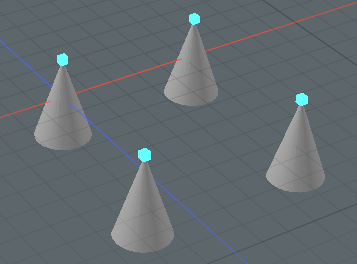 아래 예제에서 Mesh Data Array는 4 개의 원뿔이있는 메시를 가져옵니다. 각 원뿔의 상단 정점은 선택 세트의 일부입니다. a. 메쉬 데이터 배열의 속성에서 Mode 로 설정 Selection Set이며 a는 Selection Set. 선택 세트의 요소 위치에서 배열이 작성됩니다. 이 배열은 다각형 생성 메쉬 작업에서 곡선을 생성하는 데 사용됩니다.