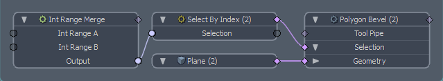 아래 예에서 Output 의 Int Range Merge 수정자는 Polygon Bevel 에 적용되는 작업 Plane (2) 망사.
