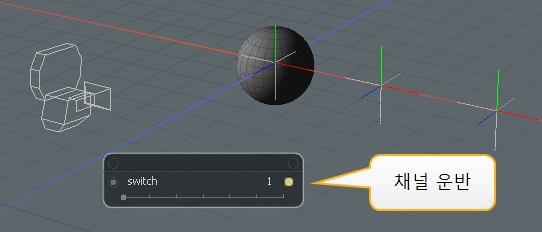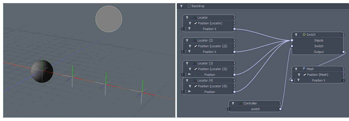 다음 예제는 Switch 수정자를 사용하는 방법을 보여줍니다. 이 경우 구를 네 위치 중 하나에 배치하는 데 사용합니다. 4 개의 로케이터 항목은 구가 이동할 수있는 4 개의 가능한 위치입니다. 그들은 모두 스위치 수정 자의 Inputs 채널. 구의 위치는 Controller, 다섯 번째 로케이터 switch 사용자 채널이 추가되었습니다. 이 switch 채널은 스위치 수정자를 구동합니다 Switch 채널. 구는 수정 자의 Output 채널, 스위치 값으로 지정된 위치로 이동합니다.