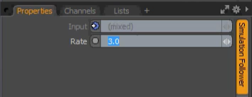아래 예에서 Plus 노드 피드에 Input Simulation Flow-Through 노드의 Output 다음 시간 단계의. dT 시간 단계마다 추가되어 점점 증가하는 값을 생성합니다. 이 설정은 로케이터 항목의 진동 모션을 생성하는 리그에 부착됩니다.