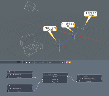 시뮬레이션 수정 자 Output 3D 뷰포트 중간에서 로케이터를 구동합니다. 두 가지 트리거가 있습니다. A 과 B 로케이터.