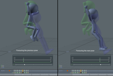 예제에서 볼 수 있듯이 Modo 수학적으로 올바른 중간 포즈 (대부분의 시간이 적당 함)를 만들지 만이 포즈는 두 포즈 사이의 선형 혼합이기 때문에 성격이나 느낌이 없습니다. 애니메이터에게는보다 재미있는 포즈를 만드는 데 유용한 출발점이됩니다.