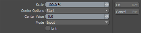 Center Options: 키를 스케일링 할 중심 위치를 결정합니다. 다음을 지정할 수 있습니다. Start, Center , End , Time 또는 User. 선택하면 Time 또는 User에서 센터를 지정합니다 Center Value 상자.