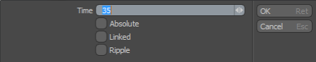 키 프레임을 선택한 후에는 키 프레임을 왼쪽이나 오른쪽으로 드래그하여 타임 라인을 따라 위치를 조정하고 선택한 다른 모든 핸들을 이동할 수 있습니다. 그래프의 빈 영역을 마우스 오른쪽 버튼으로 클릭하고 드래그하면 특정 핸들을 클릭 할 필요없이 선택한 핸들도 이동합니다. 키 프레임을 이동할 때 Modo 트랙보기의 왼쪽 상단 영역에서 실시간으로 시작한 프레임 오프셋 수 (+/-)를 나타냅니다.. 시작 프레임의 양수 값은 나중에 이동 함을 나타냅니다. 음수 값은 이전 시간을 나타냅니다. 선택 후 모든 프레임을 이동하려면 (구체적으로 선택하지 않아도 됨))에서 Ripple Edit 버튼 (소 r 아이콘)을 클릭하여 트랙보기의 왼쪽 상단에 있습니다.