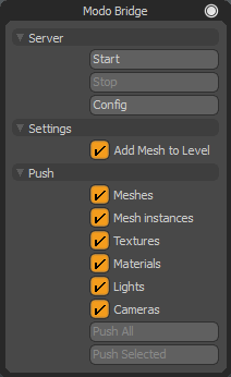푸시 할 항목을 지정한 후 메시/메시 인스턴스 /텍스처 / 기재 /등 /카메라 (메시, 카메라 및 조명) Modo 다리및 / 또는 Modo 다리 장면의 모든 해당 항목이 게임 엔진 클라이언트로 푸시됩니다. 푸시 된 모든 아이템은 게임 엔진 클라이언트에서 액터로 변환됩니다.