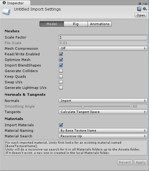 머티리얼 이름 지정 및 텍스쳐 검색을위한 메시의 일반적인 Unity 설정이 존중됩니다. 가져온 것을 선택하여 확인할 수 있습니다 .fbx 파일 및 열기 Inspector Unity 인터페이스의 오른쪽에있는 탭.