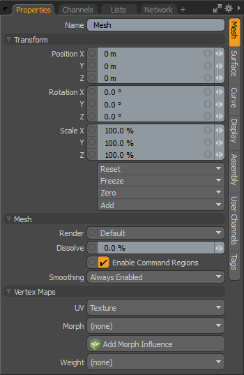 추가 할 수 있습니다 Mesh Items 를 눌러 장면에 Add Item 상단에있는 버튼 Item List 그리고 선택 Locators > Mesh. 또한 메뉴 모음 명령을 사용할 수 있습니다 Geometry > New Mesh Item. 마지막으로, 간단히 N 키보드 단축키 Model 인터페이스 레이아웃. 때 Mesh Item 를 선택하면 관련 속성을 선택할 수있게되며 Properties 뷰포트 패널.