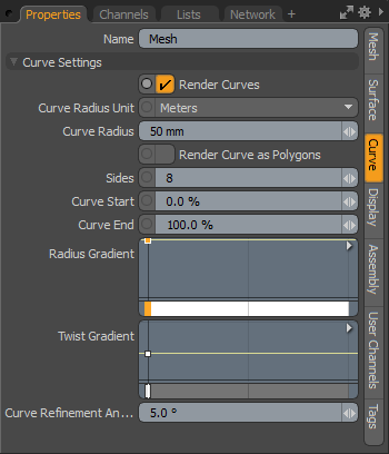 • Render Curves -일반적으로 곡선은 시각 보조 도구, 패치 안내선, 복제 경로 등과 같은 다른 기능을 용이하게하기 위해 레이어에 렌더링되지 않은 항목입니다. 그러나 Curve Radius 0보다 큰 값으로 설정하고 Render Curves 옵션을 활성화하면 이전에 볼 수 없었던 커브를 렌더링 할 수 있습니다. Modo 렌더링시에만 설정을 기반으로 절차 적으로 형상을 생성합니다. 곡면 처리를위한 재질 태그는 곡선을 선택하여 일반 다각형과 동일한 방식으로 곡선에 적용 할 수 있습니다 Polygons 모드 및 할당 Material 마치 일반 다각형 인 것처럼 태그를 지정하십시오. 그런 다음 Shader Tree 해당 머티리얼 그룹에 렌더링 시간에 커브에 적용됩니다.