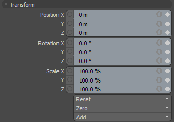 변형 항목은 변형 값을 저장하고 위치, 회전 및 배율을 제어하는 항목과 관련된 채널 그룹입니다. 기본적으로 새 항목에는 해당 항목이 표시되어 있어도 관련된 변환 항목이 없습니다. Properties 패널. 필요한 변환 만 필요에 따라 추가되어 장면 오버 헤드가 줄어들 기 때문에 최적화에 유용합니다. 그것들을 추가하는 몇 가지 방법이 있습니다. 다양한 변형 도구 중 하나를 사용하거나 값 입력 필드를 편집하여 대상 항목을 간단히 변환 할 수 있습니다. 이 작업을 수행하면 특정 변형 항목이 자동으로 Channels 뷰포트 목록. 그만큼 Add 여기에있는 기능을 사용하여 선택된 변환 세트를 채널 목록에 추가하고 기본값을 유지합니다 0,0,0 가치. 채널을 재정의하려면 참조하는 데 필요한 단계가 먼저 존재해야합니다.