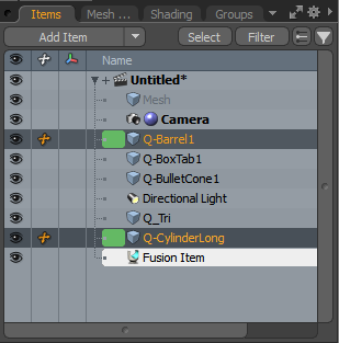 | 5. | 고르다 Q-Barrel1 과 Q-CylinderLong그런 다음 도구 상자 퓨전 탭에서 New Fusion > New Fusion with Selected Meshes. |
