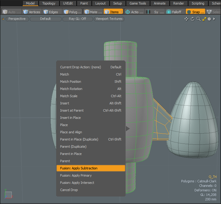 끌어서 놓기 상황에 맞는 메뉴를 사용하여 Fusion 모델을 빠르게 구축하십시오. 이 메뉴는 3D 뷰포트에서 사용할 수 있습니다. 퓨전 아이템 당신의 장면과 다른 퓨전 큐빅 프리셋.