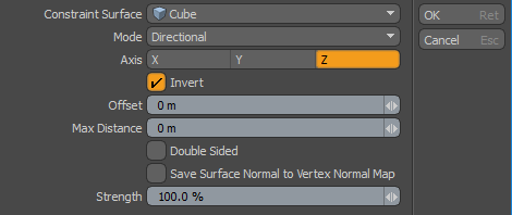 7.   로부터 Create Surface Constraint Operator 대화 상자에서 Constrain SurfaceCube, AxisZ 활성화 Invert 을 클릭하고 OK.