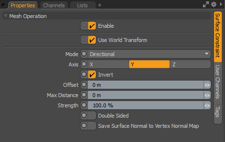 오른쪽 패널에서 Mesh Ops 탭을 클릭하십시오 Add Operator을 두 번 클릭 Mesh Operations > Deform > Surface Constraint.