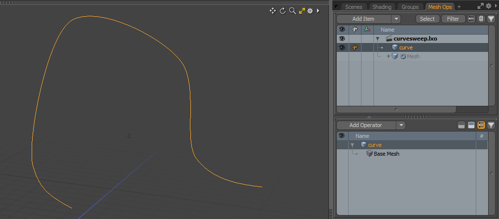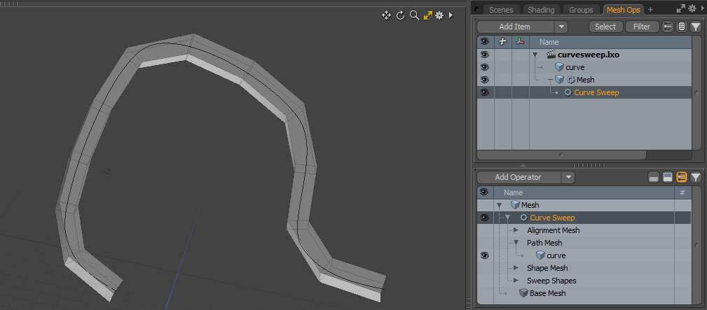 | 4. | 방금 지오메트리를 추가 한 동일한 메시에 Mesh Ops 탭을 클릭하십시오 Add Operator아래 Mesh Operations > Curves , 더블 클릭 Curve Sweep. |