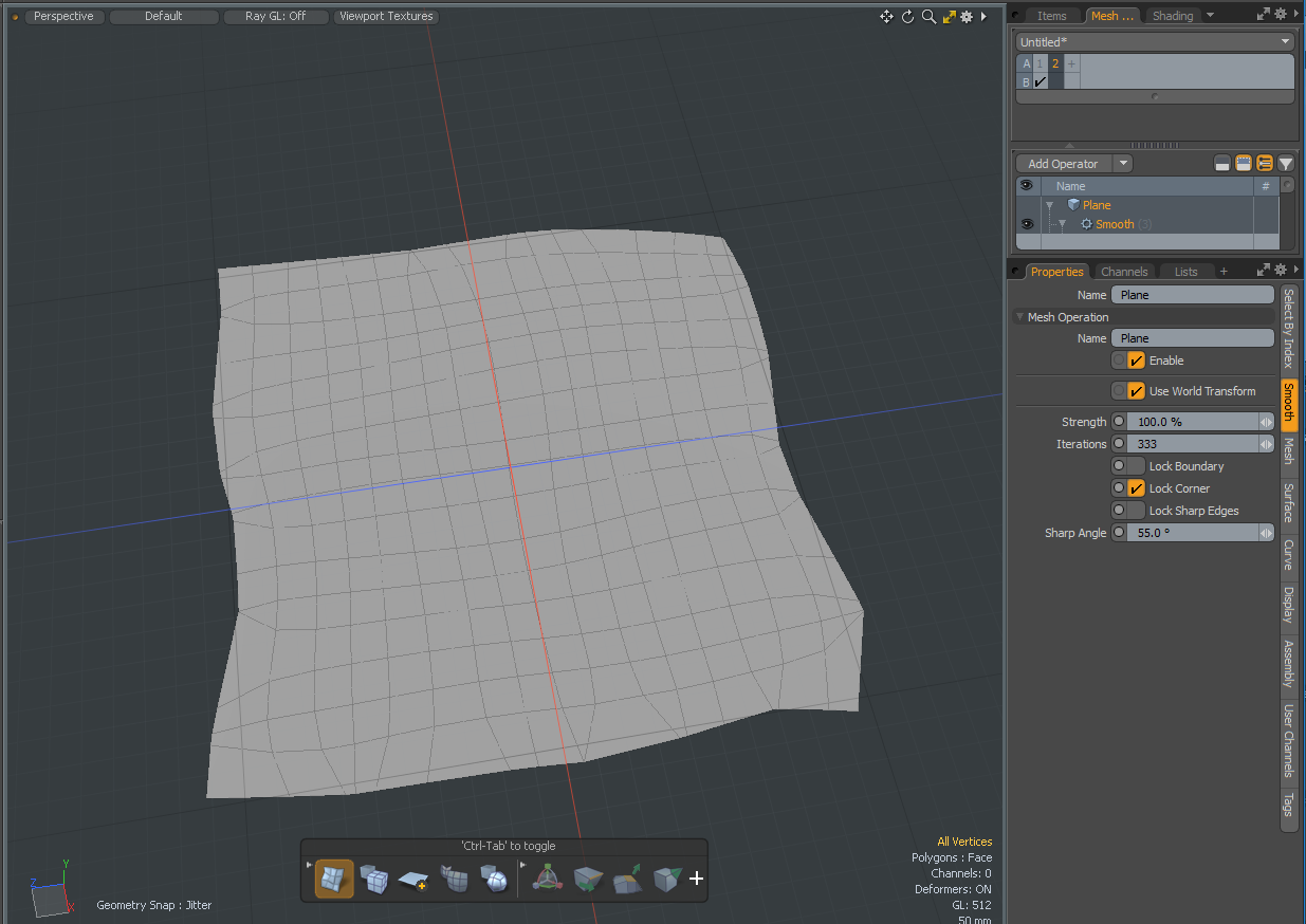 Procedural Mesh Operation: 열기 Mesh Operations 오른쪽 패널에서 탭을 클릭하십시오 Add Operator, 확장 Deform 카테고리를 클릭하고 Smooth. 자세한 내용은를 참조하십시오.부드러운 툴 절차 적 메시 작업.
