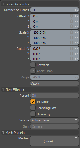 여기에 덧붙여 Linear Generator 위에서 설명한 속성 클론 도구를 사용하여 인스턴스 복제에 대해 다음 속성을 설정할 수 있습니다.