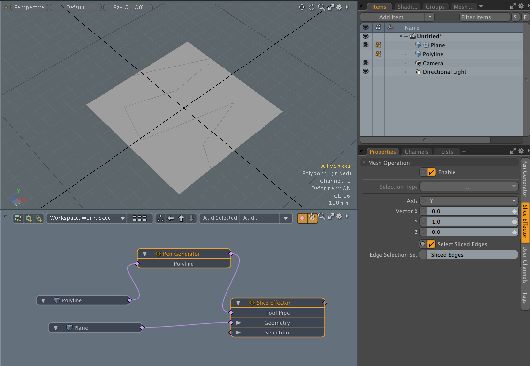 그만큼 Slice Effector 툴은 툴 제너레이터가 제공하는 파티클 위치를 따라 메시의 지오메트리를 절단하는 데 사용됩니다. Tool Pipe. 이것은 펜 슬라이스 과 커브 슬라이스 도구. 펜 슬라이스 도구는 펜 생성기 도구를 사용하여 폴리 라인 경로를 따라 형상을 슬라이스합니다. 곡선 슬라이스 도구는 곡선 경로 및 경로 단계 생성기 도구를 따라 형상을 슬라이스합니다.