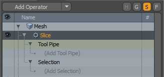 슬라이스는 절차 적 메시 작업으로도 사용할 수 있습니다. 에 도구를 추가 할 수 있습니다 Mesh Ops 탭. 에서 Model 레이아웃의 경우 인터페이스 오른쪽의 목록 옆에서 Item List.