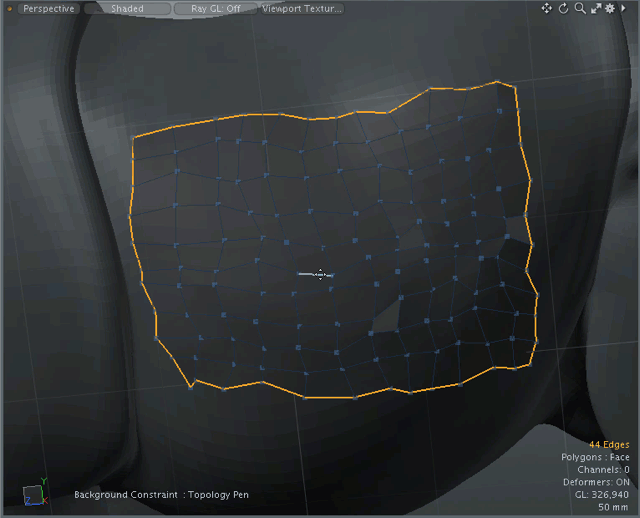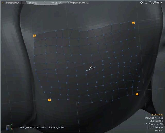 기본적으로 토폴로지 펜 도구는 배경 구속 조건 유형을 활성화합니다. Point 생성 된 모든 정점이 배경 메쉬의 표면에 직접 놓 이도록합니다. 사용하려면 Topology Pen 아이콘 Topo 인터페이스 탭의 도구 상자. 그것에서 Properties 패널에서 적절한 모드와 옵션을 선택한 다음 3D 뷰포트에서 형상을 조작합니다. 프리 하이라이트로 편집 할 기하학적 요소를 볼 수 있습니다 (포인터를 움직일 때 요소 위에 고스트 색상을 그립니다). 드래그하면 정의 된 동작이 적용됩니다.작은 노란색 상자로 표시. 상자를 움직이면 Modo 거리를 Offset X/Y/Z 가치.