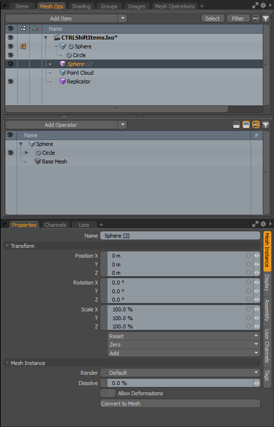 이 탭은 두 가지 목록으로 구성됩니다. 당신은 찾을 수 있습니다 Item List 그리고 Mesh Operations 그 아래에 목록을 작성하십시오.