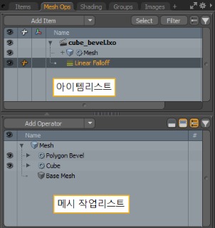그만큼 Mesh Operations 리스트에는 씬의 메시 작업리스트가 포함됩니다. 큐브 나 원통과 같은 프리미티브이거나 스무딩 또는 베벨 도구와 같은 도구 일 수 있습니다. 평가 순서는 메쉬 작업 순서에 따라 결정됩니다. Modo 맨 아래에서 메쉬 작업을 먼저 평가하고 목록에서 위로 진행합니다.