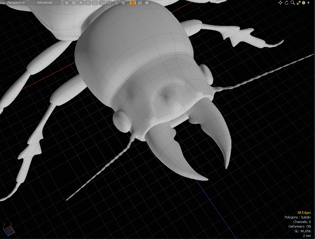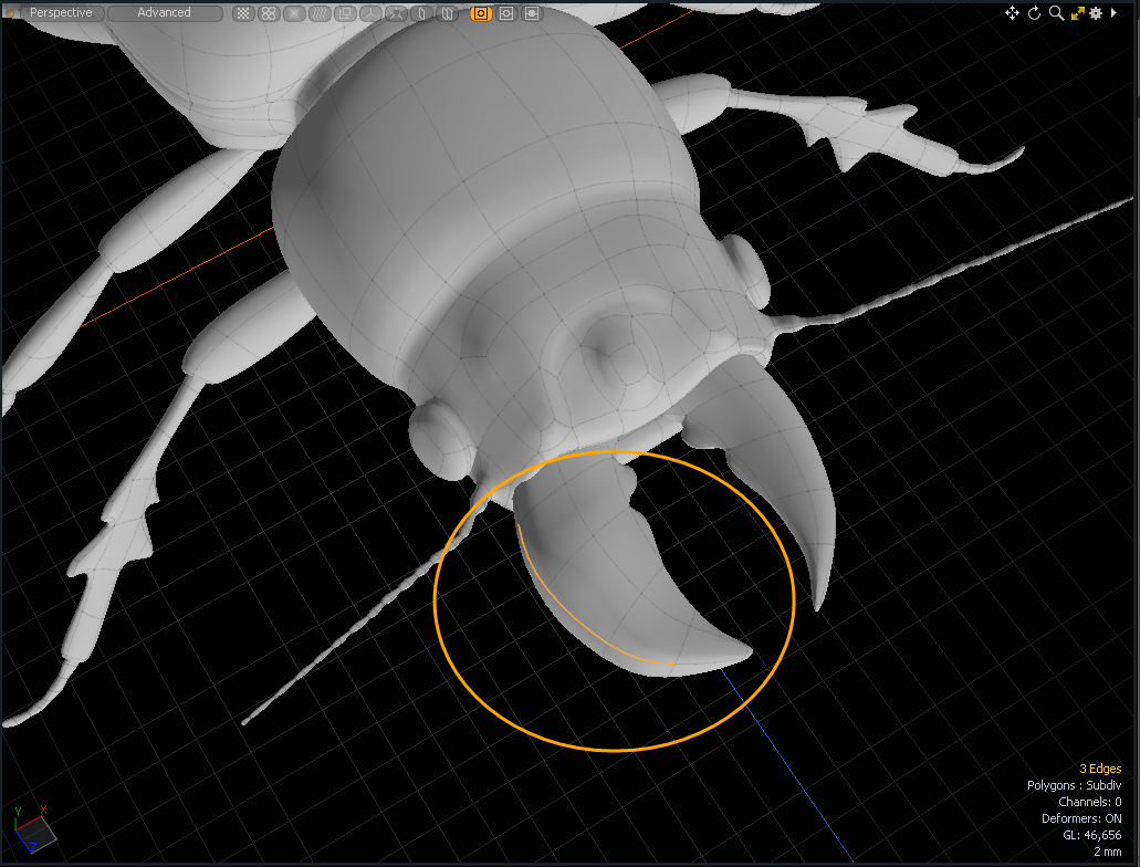 | 5. | 활성화 Edges 선택 모드 Shift딱정벌레의 왼쪽 하악골 바깥 쪽 가장자리를 + 클릭하십시오. |