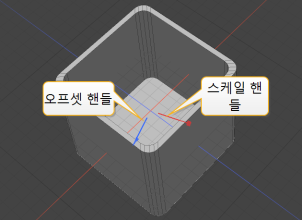 Modo 원래 다각형과 동일한 위치에 새로운 다각형 세트를 만듭니다.. 3D 뷰포트에서 도구 핸들을 볼 수 있습니다. 파란색 핸들은 오프셋을 조정하고 빨간색 핸들은 스케일을 조정합니다.