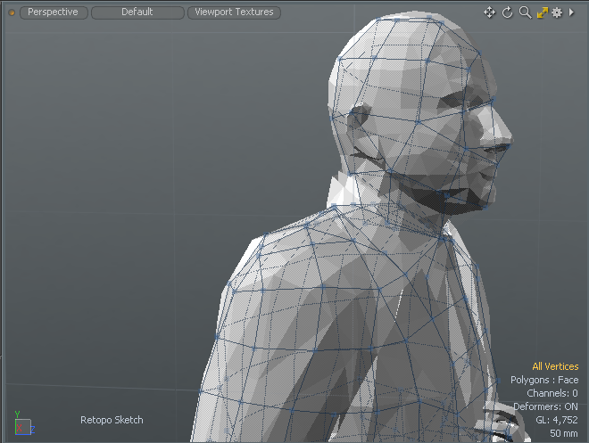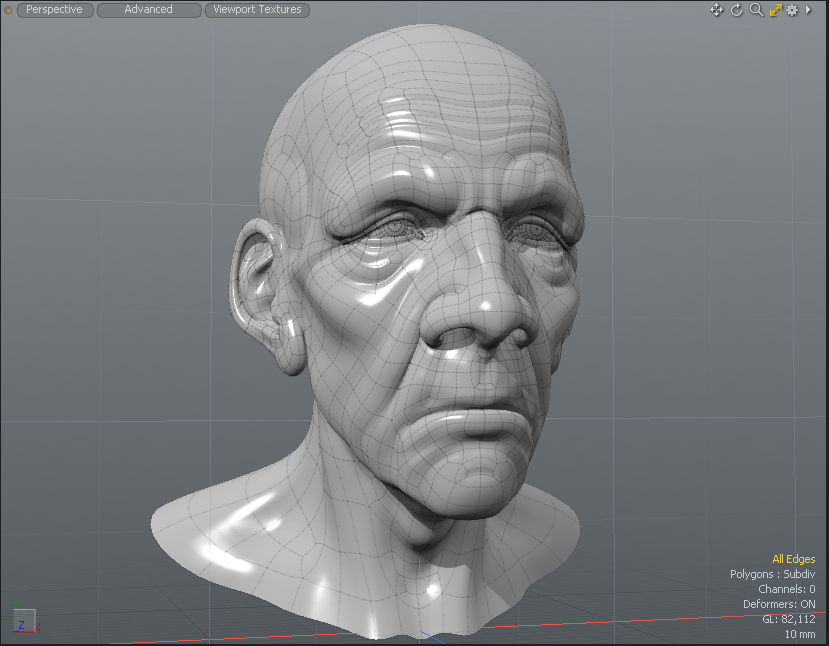 뷰포트의 왼쪽 하단에는 현재 작업 평면 방향뿐만 아니라 창의 방향에 대한 시각적 참조를 제공하는 XYZ 축 기즈모가 있습니다. 직교 뷰의 경우 아이콘에 뷰포트 창이 향하는 축 평면이 표시됩니다. 투시도에서 뷰를 회전하고 위젯 업데이트를 실시간으로 볼 수 있습니다. 오른쪽 하단에는 현재 선택된 항목, 채널 및 디 포머의 수를 보여주는 동적으로 업데이트되는 여러 정보 텍스트 표시가 있습니다. GL 디스플레이는 뷰포트에서 활성화 된 라이브 다각형의 수 (Sub-D 표면 포함)를 참조하고 아래쪽의 숫자는지면 평면의 그리드 내 사각형에 대한 실제 크기 참조를 제공합니다. 표시되는 특정 정보는의 GL 섹션에서 제어됩니다 디스플레이 환경 설정.