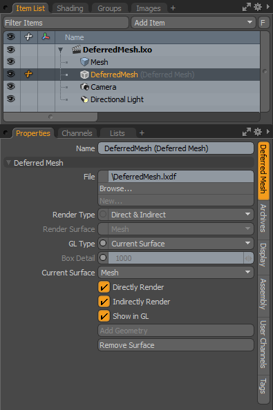 복잡하거나 기하학적으로 밀도가 높은 장면에서 Deferred Mesh 옵션은 기존의 변형되지 않은 메시를 외부에 저장된 메시로 변환하는 데 사용됩니다. .lxdf 파일. 이 동작은 렌더링 가능한 요소로 남아있는 동안 장면에서 형상을 제거합니다. 디퍼 드 메시 사용의 주요 이점은 메모리 풋 프린트 감소, 씬 인터랙션 개선 및 씬 저장 시간 단축입니다.