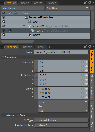 완료되면 메쉬 항목이 Item List 같은 이름으로 Deferred Mesh 안건. 에서 항목을 선택하고 속성을 조정할 수 있습니다 Properties 패널.
