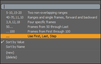 애니메이션 렌더링 중에 렌더링되는 프레임을 제어합니다. 쉼표 또는 대시를 사용하여 프레임 범위를 입력하여 렌더링 할 특정 프레임 또는 프레임 범위를 나타낼 수 있습니다. 기본 줄임표 값 (...)는 시작 범위와 종료 범위 사이의 모든 프레임을 렌더링합니다. 이 이미지는 범위 번호를 결합하는 예를 보여줍니다.
