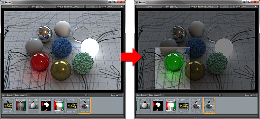 동일한 장면을 편집하면 정의 된 영역 외부의 영역이 비활성화 될 때까지 연속 렌더링에 대한 배경으로 사용됩니다. 장면 또는 이미지 해상도를 전환 할 때 영역 외부의 배경 영역이 검은 색으로 렌더링됩니다.