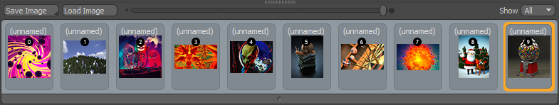 그만큼 Render Browser 렌더링 된 프레임 수에 제한이 없습니다. 기본값은 지난 10 개의 렌더링 된 프레임을 표시하도록 설정되어 있지만 Options 패널. 브라우저 자체는 두 가지 용도로 사용되며, 가장 중요한 것은 아이콘을 클릭하여 표시 영역에 표시 할 현재 이미지를 선택할 수 있다는 것입니다. 선택한 이미지의 썸네일이 주황색으로 강조 표시됩니다. 이미지 조정 컨트롤을 사용하여 선택한 이미지 만 수정할 수 있습니다. 이미지의 렌더링 순서는 각 이미지 위에 작은 숫자 아이콘을 사용하여 표시됩니다. 키보드 숫자 키를 사용하여 특정 렌더 슬롯을 선택하고 해당 숫자 키를 누르기 만하면 다른 렌더간에 쉽게 전환 할 수 있습니다.
