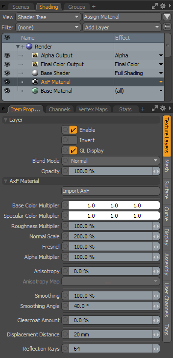 AxF 재질을 만들려면 Shader Tree클릭 Add Layer > Custom Materials > AxF Material. 재질이 쉐이더 트리에 추가되고 레이어의 Properties 패널 디스플레이.
