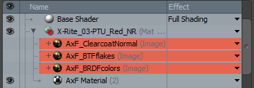 Modo 버전 1.0, 1.1, 1.4 및 1.5의 AxF 재질을 지원합니다. 다른 버전에는 다음과 같은 구성 요소가 포함될 수 있습니다. Modo 인식하지 못합니다. 구성 요소가 지원되지 않는 경우 Modo셰이더 트리에서 빨간색으로 표시되며 그 효과는 재질에 영향을 미치지 않습니다.