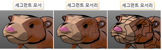 이 값은 근처 표면 세그먼트와 겹칠 셀 가장자리의 백분율을 지정합니다. 다음 이미지는 Segment Edges 로 설정 0%, 50% , 100% 각기.