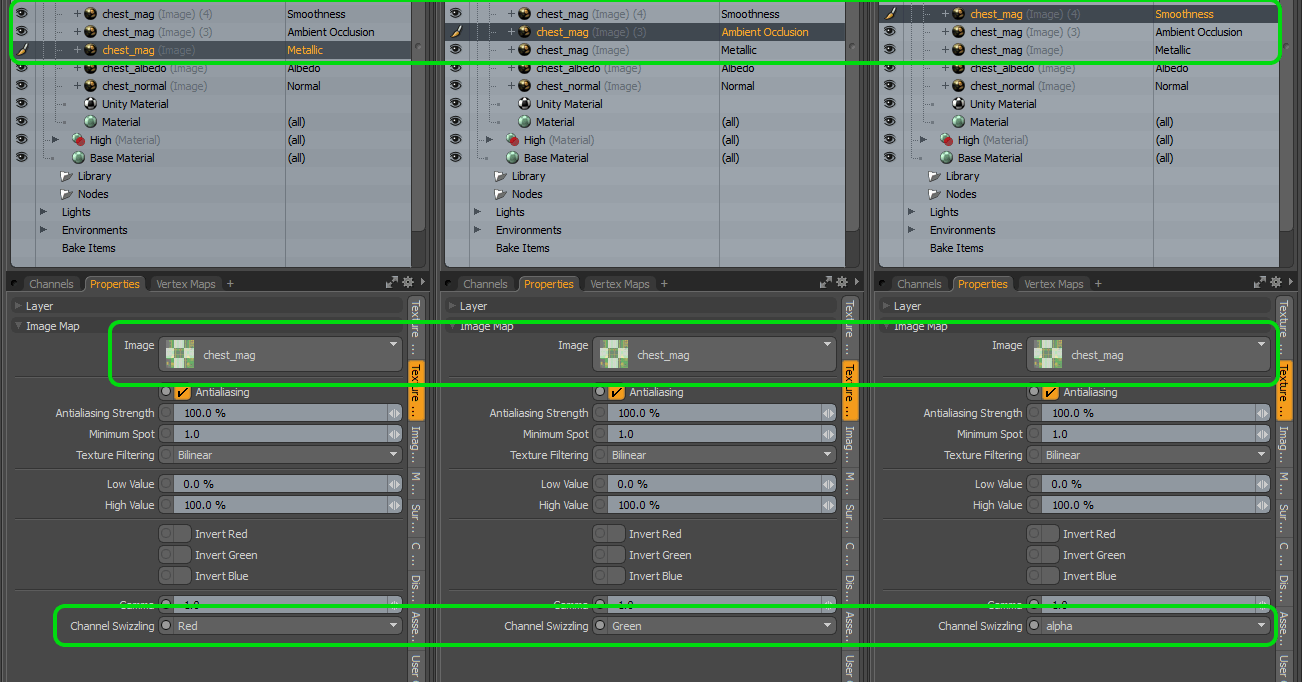 | 2. | 에서 Properties 패널 Texture Layers 하위 탭에서 Swizzling 선택권. |