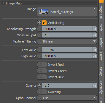 메뉴 표시 줄에서을 클릭하여 이미지 맵을 추가 할 수 있습니다 Texture > Add Shader Tree Layer > Image Map 또는 Add Layer 전체의 상단에 기능 셰이더 트리. 이미지 맵 항목에는 직접 관련된 모든 속성이 포함됩니다 Modo의 비트 맵 사용법과 Properties 항목 레이어가 선택된 경우 뷰포트 Shader Tree. 스케일, 위치, 투영 및 기타 매핑 관련 설정은 관련 텍스처 로케이터.